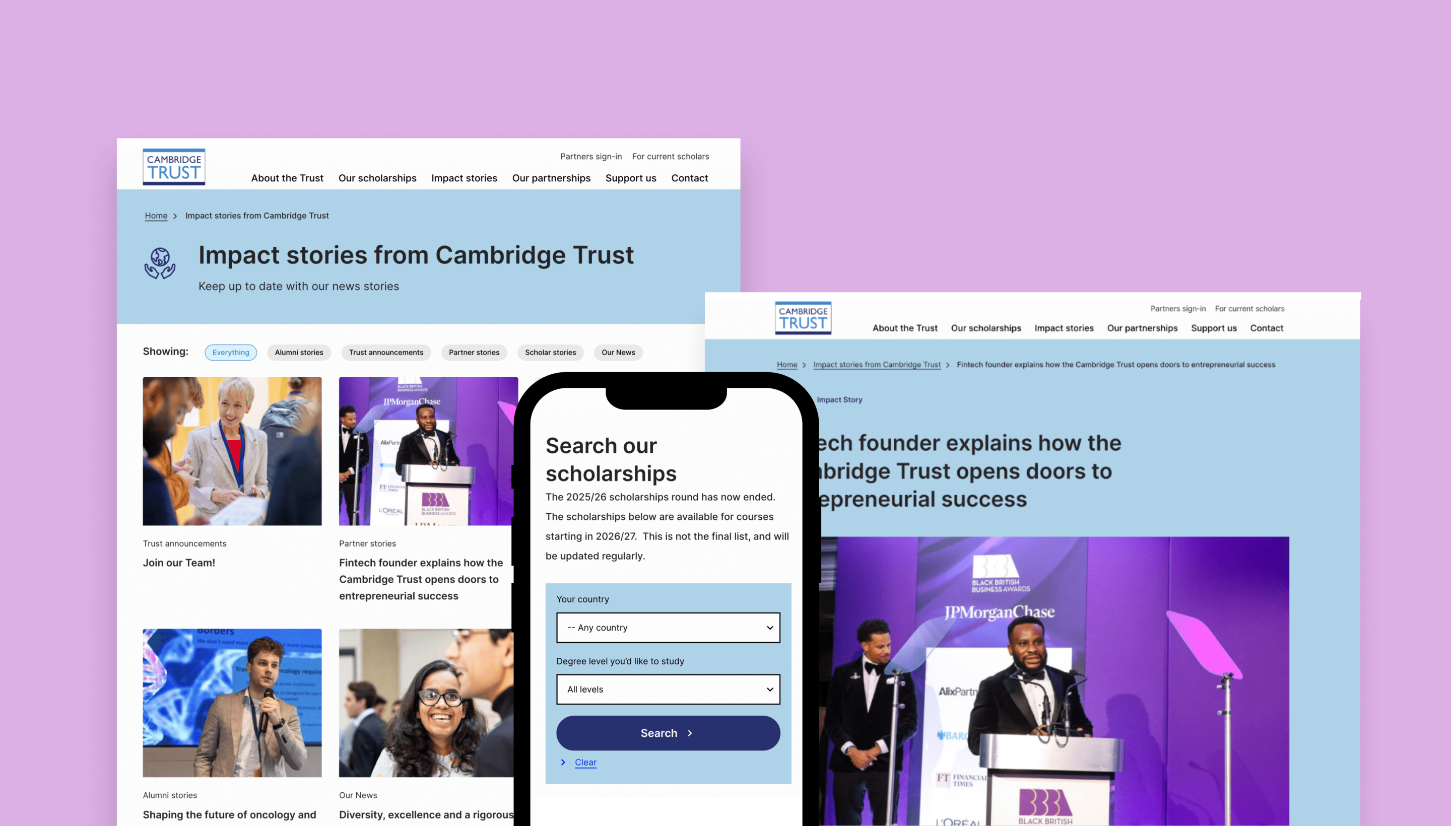 The Trust’s website didn’t present a true reflection of their achievements, successes, and opportunities. The Trust wanted to improve the website by making it easier for users to find content and providing students with a better understanding of the process of applying for scholarships. They also wanted to celebrate the positive impact of their work.