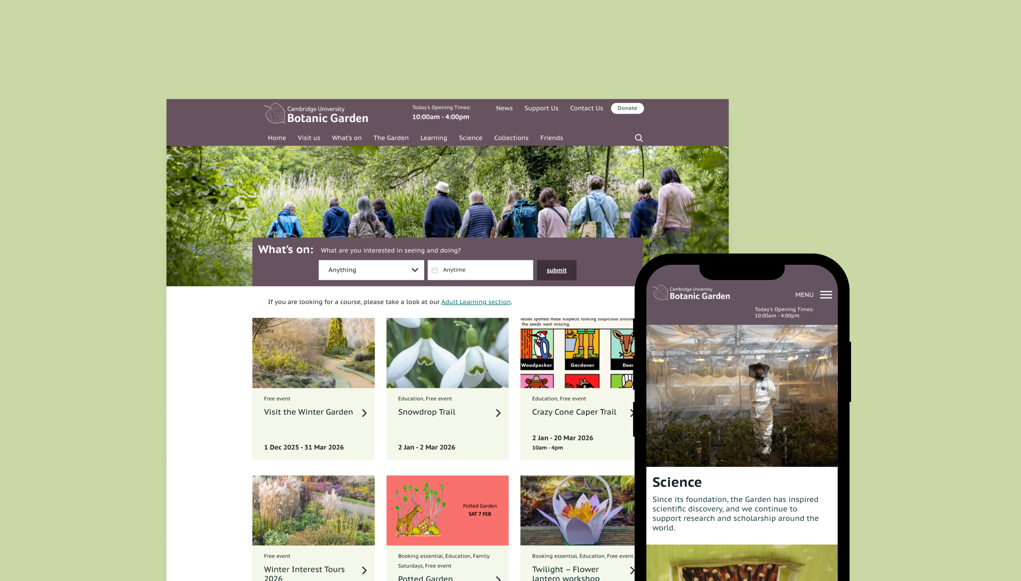 We partnered with Cambridge University Botanic Garden (CUBG), one of the most visited attractions in the city, to help revitalise their online presence. We redesigned their website to reflect the ever-changing garden, promote its vital scientific work, and improve engagement through visitor numbers, memberships and programme participation.