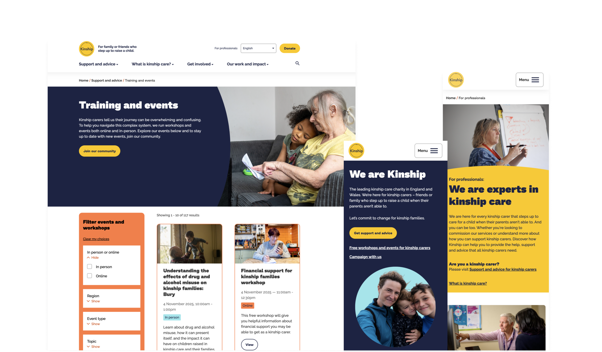 The charity used this opportunity to review and update the Kinship visual identity. We carried out a design update to the components and templates with an updated colour palette, photographic direction, and fonts.
